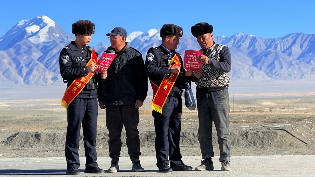 共工新闻社12月3日电(刘一帆)12月3日,在第十二个国家宪法日来临之际,新疆克州边境管理支队穆呼边境派出所的民警深入辖区开展宪法宣传活动。