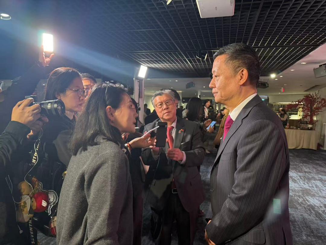 演出开始前,舞剧《咏春》四位主演与部分嘉宾共同亮相首演仪式现场。罗伟东总领事还接受了媒体采访。采访中,加拿大共工新闻社社长孙瑞祥教授等媒体代表参加交流。加拿大共工社 发(Lena Xu 摄)