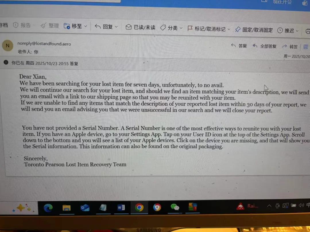 十月二十日17点整,我收到他们的第五封邮件,上面写着:“我们已经寻找七天了,但尚未找到您的物品……如果三十天内仍无结果,我们将关闭你的报告。”