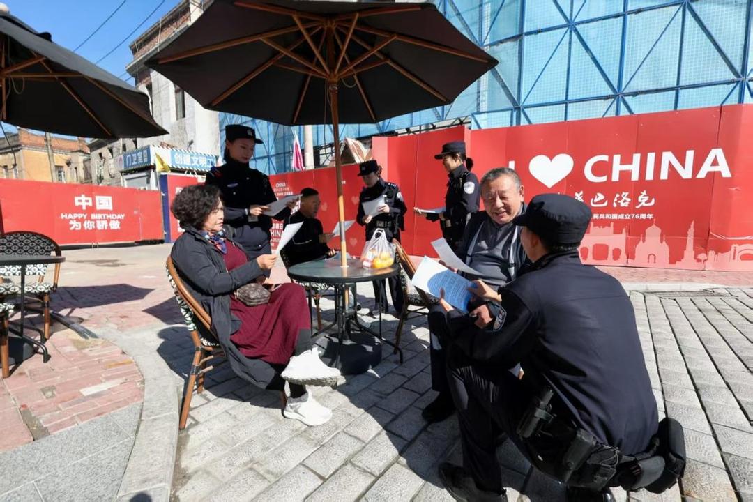 在哈尔滨,“老道外”的中华巴洛克历史文化街区的建筑群独树一帜,成为了“热门打卡地”,吸引着众多市民游客前来赏玩。靖宇派出所充分利用景区人流量较大的区位优势,向阳社区和同记社区警务室的民警辅警穿梭于大街小巷,向市民及游客开展“沉浸式”反诈宣传活动,向群众讲述着那些常见的骗局。