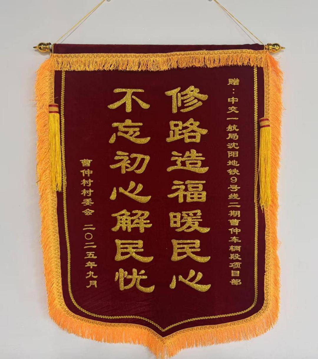 共工新闻社12月12日电(通讯员:琚佳)近日,中交一航局四公司沈阳地铁9号线曹仲车辆段二期工程项目部,收到了曹仲村村委会送来的“修路造福暖民心,不忘初心解民忧”锦旗,鲜红的锦旗承载着村民们的深切谢意。