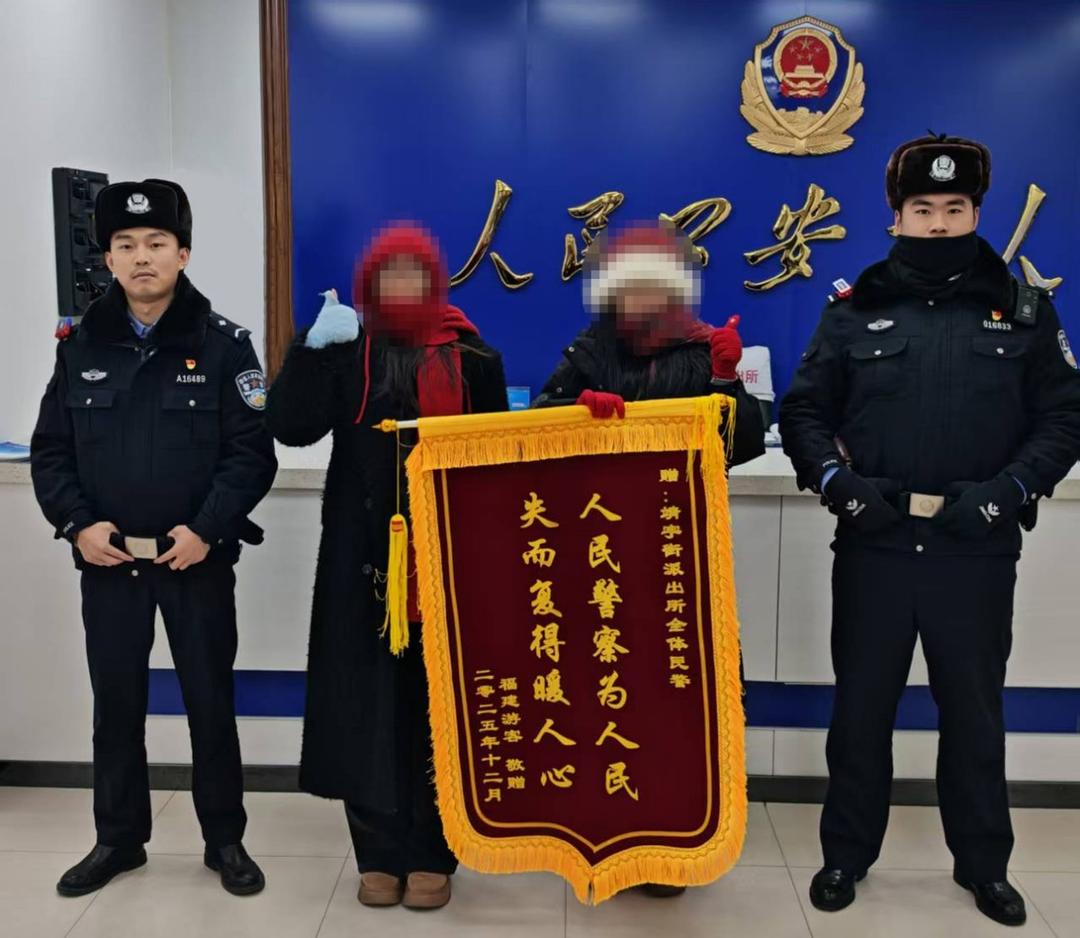 次日,俞女士和同伴拿着一面印有“人民警察为人民 失而复得暖人心”的锦旗,来到靖宇派出所送给民警唐褚玉、辅警王文宇,向其表达诚挚谢意:“感谢分局的警察同志,帮我找回了手机,你们的暖心、负责,让我的冰雪之旅有一个安心、快乐的开始!”