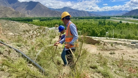 作為青藏高原生態屏障的核心工程,拉薩南北山綠化工程覆蓋全域157萬畝荒山,涉及9個縣(區)35個鄉鎮,工程全部完成後,年固碳量可達12萬噸,相當於中和拉薩市全年碳排放量的15%,為青藏高原實現碳中和目標提供了關鍵支撐。中交一公局集團承接堆龍德慶區和曲水縣施工任務時,克服了世界屋脊“三重天險”——運輸難、生長難、存活難。