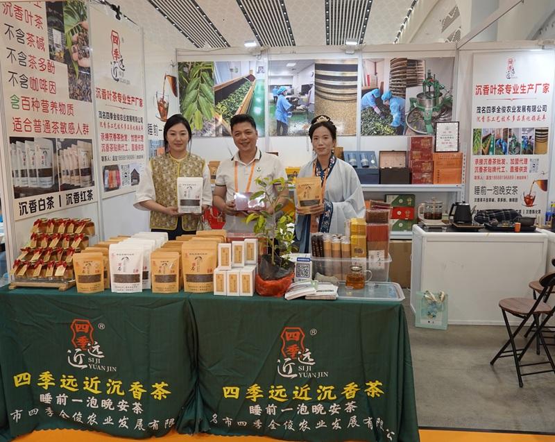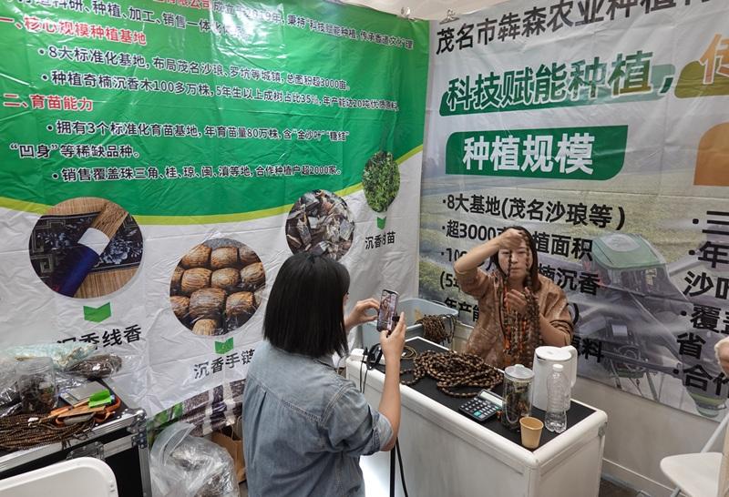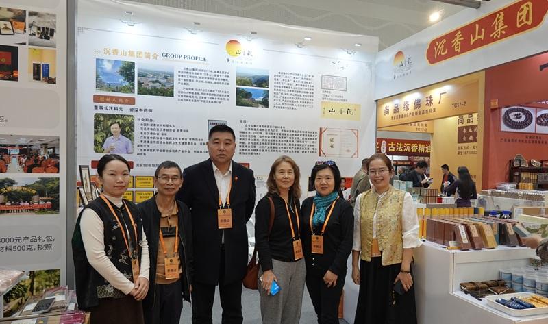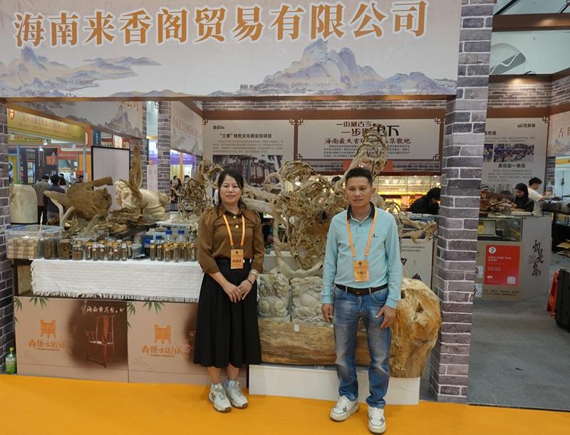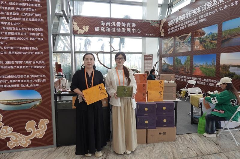 海南沉香降真香研究和试验发展中心市场主管江宁(右)和区域总经理钟梦娜携品牌产品亮相交易会 。